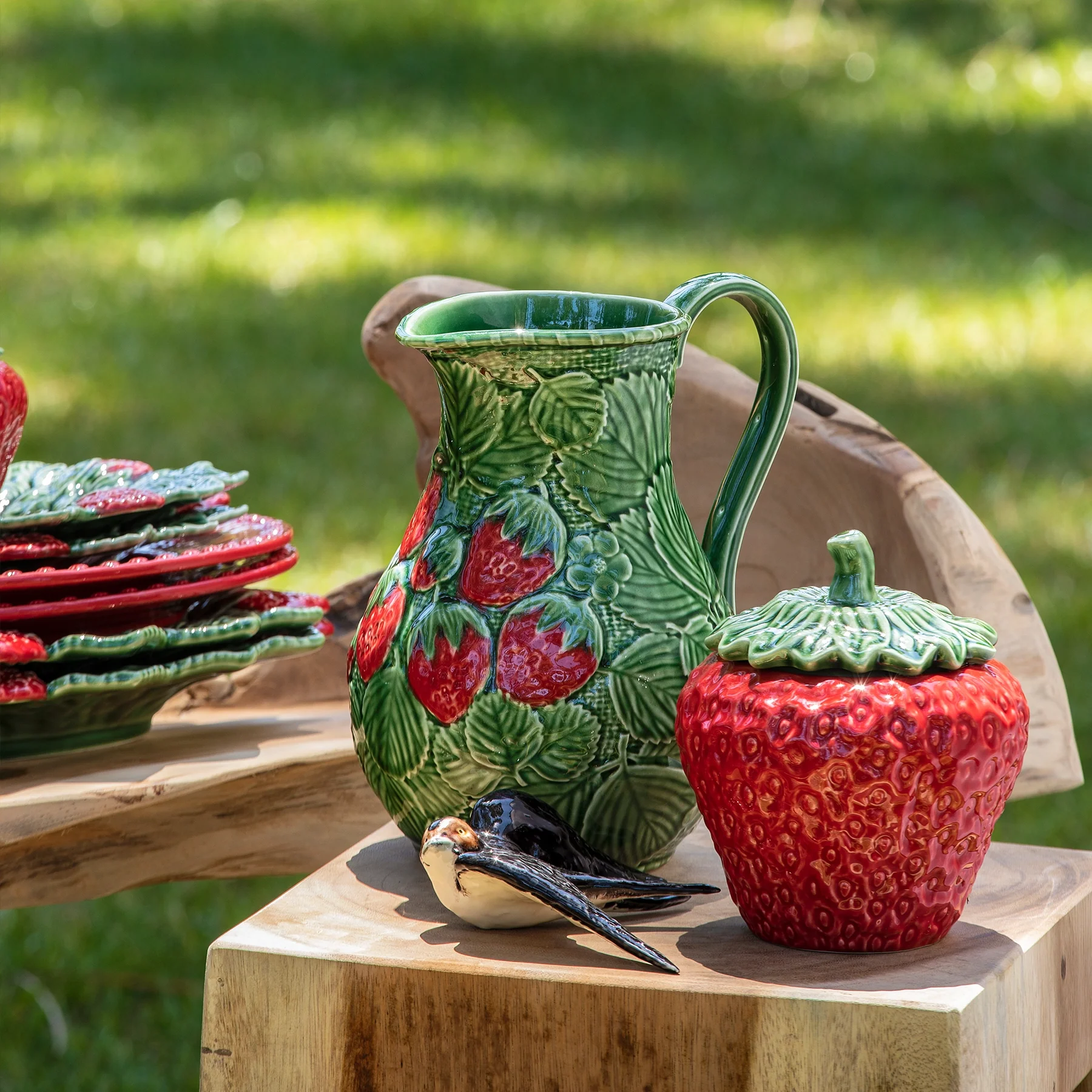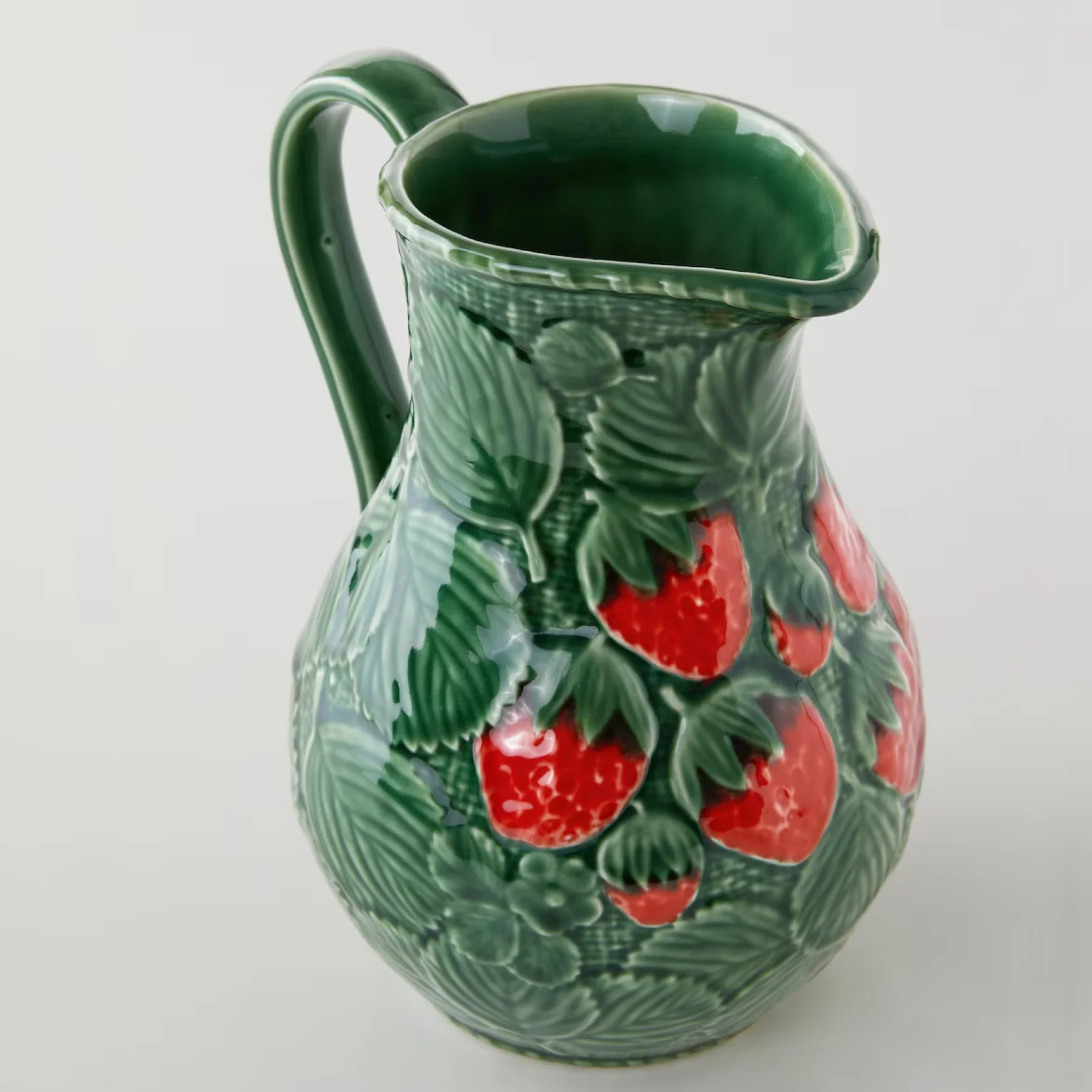 Parte de la icónica colección Morango de Bordallo Pinheiro, cada jarra es elaborada y pintada a mano en Portugal, reflejando el saber hacer de generaciones de ceramistas.