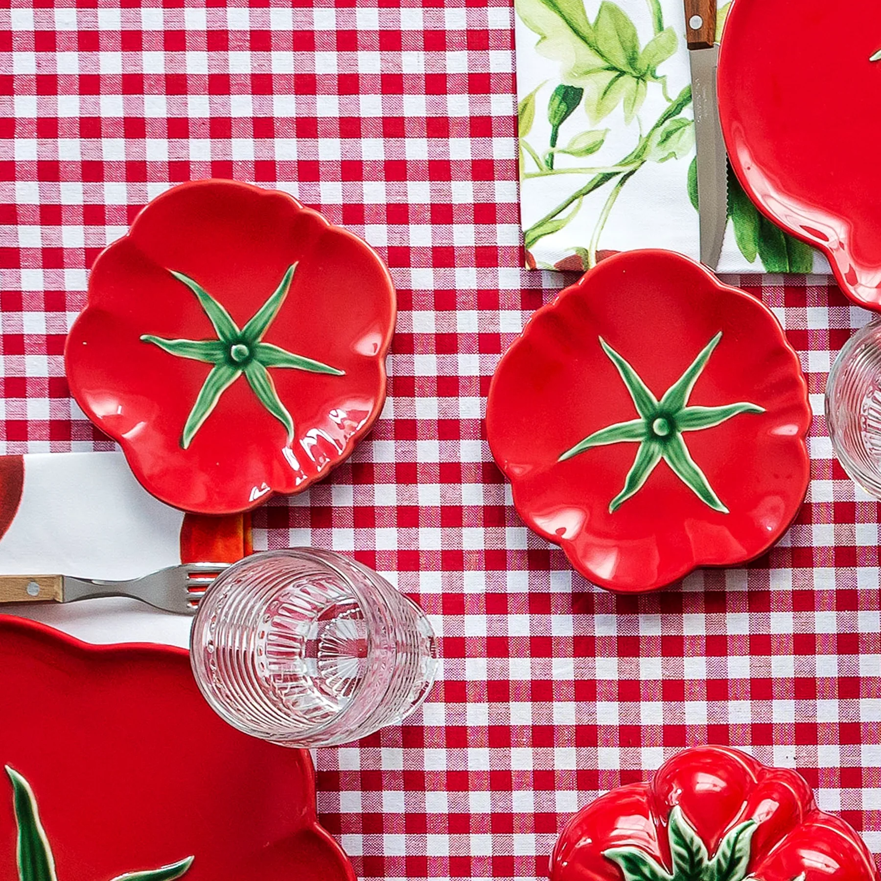 Su diseño, con relieves y colores intensos que evocan tomates maduros, añade frescura y un toque lúdico a cualquier comida.